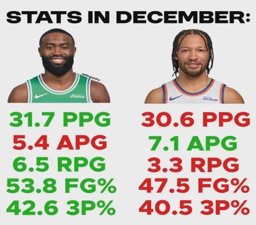 很多球迷为布朗鸣不平,认为他应该是东部月最佳。12月份尼克斯10胜4负,胜率71.4%;凯尔特人9胜3负,胜率75%。杰伦-布朗12月份场均31.7分5.4助攻6.5篮板,投篮命中率53.8%、三分命中率42.6%。其中场均得分领跑联盟。